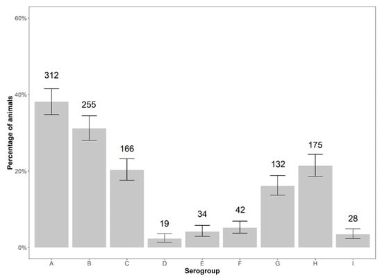The most prevalent serogroup on the animal level was serogroup A with 312 positive animals (38.10%), followed by serogroup B with 255 animals (31.14%) and H with 175 animals (21.37%) (Figure 3).