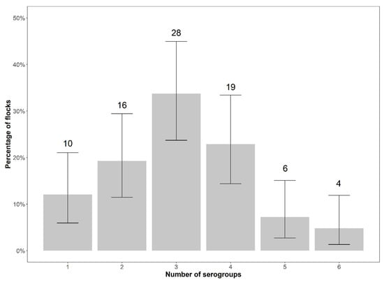 The number of serogroups per flock ranged from one to six. In 28 flocks (33.74%), three serogroups were detected; 19 flocks (22.89%) had four serogroups, 16 flocks (19.28%) had two serogroups, ten flocks (12.05%) had a single serogroup and four flocks (4.82%) had six serogroups present at the same time. On average, 3.10 serogroups per flock were detected, and a frequency of 87.95% of the flocks had more than one serogroup present (Figure 4).