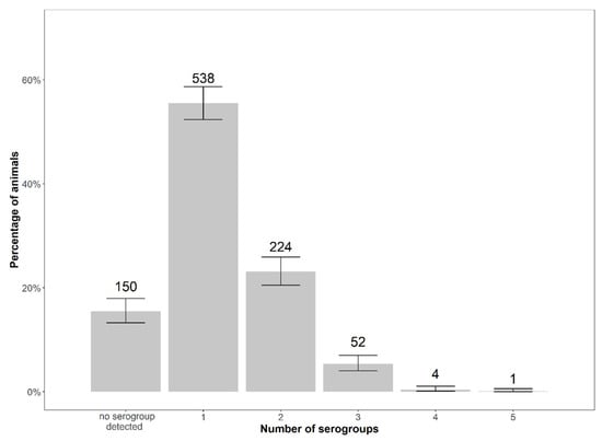 Number and percentage (referring to 969) of animals by number of serogroups detected per animal with exact binomial 95% confidence intervals.