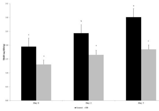 The concentrations of vitamins E and A in the meat are reported in Table 4. The concentration of vitamin E (VE) was not affected by dietary treatment (p > 0.05), while the concentration of retinol (vitamin A) tended to be influenced by the diet, being greater in the group treated with the EB (p = 0.078).