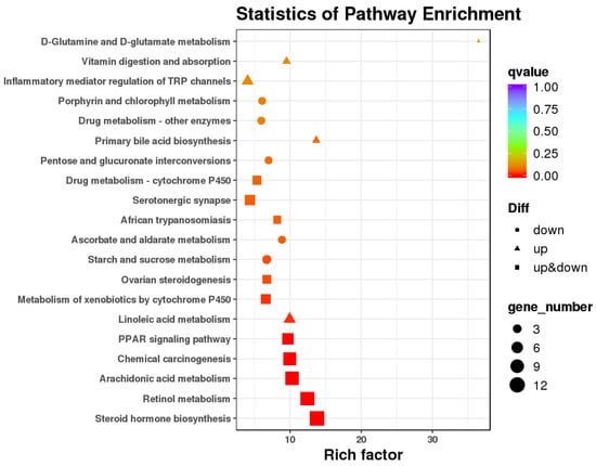 Relative expression levels of the DEGs from RNAseq were evaluated by real-time qPCR in liver from groups. Generally, total RNA was extracted from liver by TRIzol Reagent (Thermo Fisher Scientific, Waltham, MA, USA). The concentrations of RNA were determined by using NanoDrop™ One spectrophotometer (Thermo Fisher Scientific, Waltham, MA, USA). Then, mRNA was reverse transcribed into cDNA by following to the manufacture’s steps of PrimeScript™ RT reagent Kit with gDNA Eraser (RR047A, TaKaRa, Beijing, China). Primer sequences are presented in Table S1. The relative expression of mRNA was determined by using TB Green® Premix Ex Taq™ II (RR820A, TaKaRa) with the CFX96 Touch™ Real-Time PCR Detection System (Bio-Rad). The qPCR thermal cycling conditions were 95 °C for 30 s, then 40 cycles of 95 °C for 5 s, 60 °C for 30 s, and 72 °C for 30 s. Relative mRNA expression levels were determined from the threshold cycle (Ct) values using the 2−ΔΔCt comparative method [].
