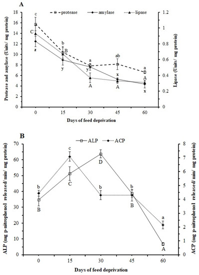 - Furne, M.; Garcia-Gallego, M.; Hidalgo, M.C.; Morales, A.E.; Domezain, A.; Domezain, J.; Sanz, A. Effect of starvation and refeeding on digestive enzyme activities in sturgeon (Acipenser naccarii) and trout (Oncorhynchus mykiss). Comp. Biochem. Physiol. A Mol. Integr. Physiol. 2008, 149, 420–425. [Google Scholar] [CrossRef]