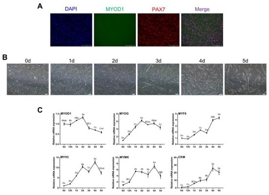 Figure 1. Identification of bovine skeletal myoblasts. (A) Identification of myoblasts by immunofluorescence based on MYOD1 (green) and PAX7 (red) expression at 48 h of growth (scale bar: 200 μm). Nuclei were counterstained with DAPI (blue). (B) Myotube formation on days 0, 1, 2, 3, 4 and 5 after induction of myogenic differentiation (bright field, scale bar: 200 μm). (C) Relative mRNA expression of skeletal-specific myogenic genes (MYOD1, MYOG, MYF6, MYH3, MYMK and CKM) during myoblast differentiation. The results were normalized to GAPDH levels and are presented as the means ± SDs from three independent experiments. Different capital letters indicate very significant differences (p < 0.01), different lowercase letters indicate significant differences (p < 0.05), and the same letters indicate no significant differences (p > 0.05) using one-way ANOVA with Tukey’s correction.