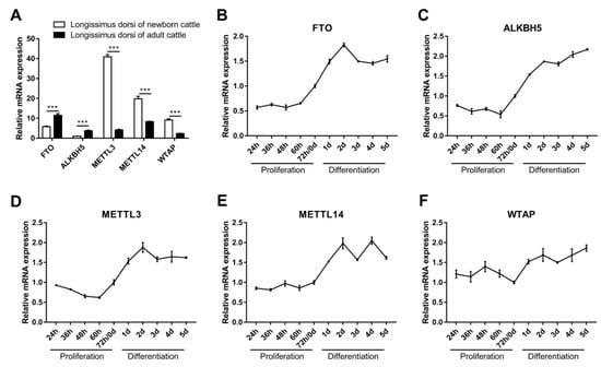 Figure 2. The mRNA expression of FTO, ALKBH5, METTL3, METTL14 and WTAP. (A) Relative mRNA expression of FTO, ALKBH5, METTL3, METTL14 and WTAP in longissimus dorsi muscles of newborn (1-day-old) and adult (24-month-old) cattle. (BF) Relative mRNA expression of (B) FTO, (C) ALKBH5, (D) METTL3, (E) METTL14 and (F) WTAP during proliferation and differentiation of bovine myoblasts. GAPDH was the normalization control. Results are presented as the means ± SDs from three independent experiments. *** p < 0.001, using Student’s t test.