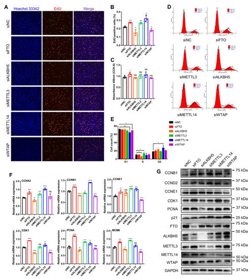 Figure 3. Knockdown of m6A methylase genes regulates bovine myoblast proliferation. The bovine myoblasts were transfected with siNC or siRNAs (siFTO, siALKBH5, siMETTL3, siMETTL14 or siWTAP) for 48 h. (A) The proliferation of myoblasts was detected by EdU (red) staining (scale bar: 200 μm). Nuclei were stained with Hoechst 33342 (blue). (B) The percentage of EdU-positive cells in (A) was calculated. For each group, three random microscopic fields were selected randomly. (C) CCK-8 assays detected the absorbance value at 450 nm to indicate the cell proliferation index. (D,E) Flow cytometry detected and analyzed the different phases of the cell cycle. (F) RT-qPCR was performed to detect the relative mRNA expression of cell cycle factors, including CCNA2, CCNB1, CCNE1, CDK1, PCNA and MCM6. GAPDH was the normalization control. (G) Western blot assays demonstrating the expression levels of CCNB1, CCND1, CCNE1, CDK1, PCNA, p21, FTO, ALKBH5, METTL3, METTL14, WTAP and GAPDH proteins in different treated cells. (B,C,E,F) Results are presented as the means ± SDs from three independent experiments. Using Student’s t test, * p < 0.05, ** p < 0.01, *** p < 0.001 and ns = no significance.