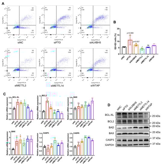 Figure 4. Knockdown of m6A methylase genes regulates bovine myoblast apoptosis. Bovine myoblasts were transfected with siNC or siRNAs (siFTO, siALKBH5, siMETTL3, siMETTL14 or siWTAP) for 36 h. (A,B) Flow cytometry detection and analysis and the percentage of apoptotic cell counts. Q1 is cell debris, Q2 is late apoptotic cells, Q3 is early apoptotic cells, and Q4 is live cells. (C) RT-qPCR was performed to detect the relative mRNA expression of apoptosis-related genes, including BCL-XL, BCL2, BAD, BAX, CASP3 and CASP6. GAPDH was the normalization control. (D) Western blot assays demonstrating the expression levels of BCL-XL, BCL2, BAD, BAX, CASP3 and GAPDH proteins in different treated cells. (B,C) Results are presented as the means ± SDs from three independent experiments. Using Student’s t test, * p < 0.05, ** p < 0.01, *** p < 0.001 and ns = no significance.