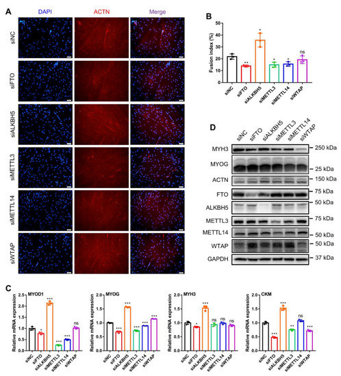 Figure 5. Knockdown of m6A methylase genes regulates bovine myoblast differentiation. Bovine myoblasts were induced for myogenic differentiation 24 h after transfection with siNC or siRNAs (siFTO, siALKBH5, siMETTL3, siMETTL14 or siWTAP). (A) Fluorescence staining of MYHC protein (red) indicates myotube formation on day 3 of myoblast differentiation. Nuclei were stained with DAPI (blue). (B) The fusion index was calculated as the percentage of nuclei in fused myotubes out of the total number of nuclei. For each group, three random microscopic fields were selected randomly. (C) RT-qPCR was performed to detect the relative mRNA expression of MYOD1, MYOG, MYH3 and CKM on day 3 of myoblast differentiation. GAPDH was the normalization control. (D) Western blot assays demonstrating the expression levels of MYH3, MYOG, ACTN, FTO, ALKBH5, METTL3, METTL14, WTAP and GAPDH proteins in different treated cells. (B,C) Results are presented as the means ± SDs from three independent experiments. Using Student’s t test, * p < 0.05, ** p < 0.01, *** p < 0.001 and ns = no significance.