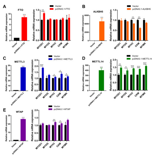 Figure 6. Overexpression of m6A methylase genes regulates bovine myoblast differentiation. Bovine myoblasts were induced for myogenic differentiation 24 h after transfection with empty vector or expression plasmids. (AE) RT-qPCR was performed to detect the mRNA expression of (A) FTO, (B) ALKBH5, (C) METTL3, (D) METTL14 and (E) WTAP, reflecting the overexpression efficiency of the expressed plasmids after transfection. Then, the relative mRNA expression of MYOD1, MYOG, MYH3, CKM and MYMK on day 3 of myoblast differentiation was detected. GAPDH was the normalization control. Results are presented as the means ± SDs from three independent experiments. Using Student’s t test, * p < 0.05, ** p < 0.01, *** p < 0.001.