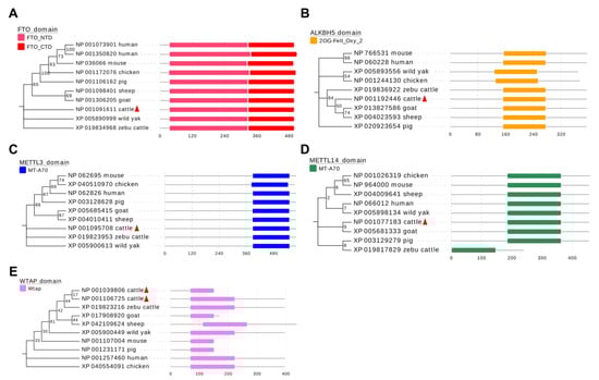 Figure 7. Phylogenetic tree and conserved function domains in the m6A methylases. (A) FTO, (B) ALKBH5, (C) METTL3, (D) METTL14 and (E) WTAP, visualized using MEGA7 software and the EvolView online tool.