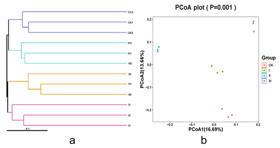 Principal coordinate analysis (PCoA) (b) based on the unweighted UniFrac distance (a) of the intestinal microbial communities.