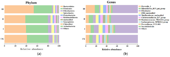 Figure 1 showed that the effects of different mixed hays on Beta diversity of rumen bacteria. According to the results of species annotation, a total of 21 species of rumen bacteria were detected at the phylum level of the Saanen goats. The relative abundance of bacterial genera of the four diet groups was reported (Figure 2a). Bacteroidetes, Firmicutes, Fibrobacteres, Spirochaetes, and Proteobacteria were the relatively abundant bacteria in the rumen microorganisms. As shown in Figure 2, the composition of rumen bacteria was mainly Bacteroidetes, and the relative abundance of Bacteroidetes in group III was significantly higher than that in the other three groups (p < 0.05); however, the relative abundance of Firmicutes and Fibrobacteres was lower than that in the other three groups. The relative abundance of Proteobacteria in group II was higher than in the other three groups. At the genus level (Figure 2b), Prevotella_1, Rikenellaceae_RC9_gut_group, Fibrobacter, and Christensenellaceae_R7_group were the dominant bacterium groups. The relative abundance of Prevotella in group III was significantly higher than that in other groups (p < 0.05); Compared with the control group, groups II and III showed a higher relative abundance of the Rikenellaceae_RC9_gut_group (p > 0.05), whereas the relative abundance of Fibrobacter showed the opposite trend, and was lower in groups II and III compared to the CK group.