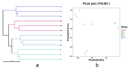 Principal coordinate analysis (PCoA) (b) based on the unweighted UniFrac distance (a) of the rumen microbial communities.