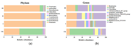 Figure 3 showed that the effects of different mixed hays on Beta diversity of intestinal bacteria. According to the results of species annotation, a total of 27 species of intestinal bacteria were detected at the phylum level of the Saanen goats (Figure 4a). Firmicutes, Proteobacteria, Actinobacteria, Cyanobacteria, and Bacteroidetes were the relatively abundant bacteria in the intestinal microorganisms. The relative abundance of Firmicutes in groups I, II, and III were significantly higher than in the CK group (p < 0.05). The relative abundance of Actinobacteria in the intestines were significantly higher (p < 0.05) in goats fed the crop stalks (corn and wheat) + alfalfa than in any other treatments. Group II showed a particularly higher (p < 0.05) relative abundance of Bacteroidetes compared to other groups. At the level of genus (Figure 4b), Romboutsia, Lawsonia, Clostridium, Christensenellaceae_R7_group, and Ruminococcaceae_NK4A214_group had higher counts compared with the others. The relative abundance of Romboutsia and Clostridium in groups I, II, and III were significantly higher (p < 0.05) than in the CK group; on the contrary, the relative abundance of Lawsonia was significantly lower (p < 0.05) than in the CK group. The relative abundances of the Christensenellaceae_R7_group in group II and the CK group were higher (p < 0.05) than in groups I and III.