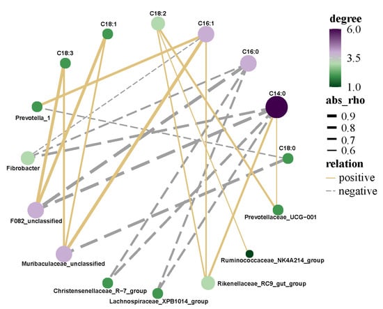 Pearson’s correlations between fatty acids and rumen bacterial composition at the genus level are shown in Figure 5. C14:0 and C16:0 were negatively associated with F082_unclassified, Fibrobacter, Christensenellaceae_R-7_group, and Lachnospiraceae_XPB1014_group; C14:0 also correlated positively with Prevotellaceae_UCG-001 and Rikenellaceae_RC9_gut_group. C18:0 was the only saturated fatty acid negatively correlated with Muribaculaceae_unclassified. C16:1 correlated positively with Muribaculaceae_unclassified and Prevotella_1, whereas Prevotella_1 only had a significant relationship with C16:1. The concentrations of C18:1 and C18:3 were positively correlated with the genus Muribaculaceae_unclassified and F082_unclassified. C18:2 was positively associated with the relative abundances of Prevotellaceae_UCG-001 and Rikenellaceae_RC9_gut_group.