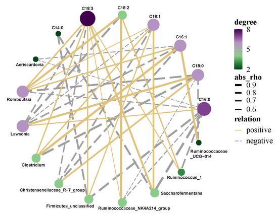The fatty acids in ruminant products are mainly affected by dietary nutrition and rumen metabolism of bacteria [48]. Rumen microbial fermentation plays an important role in impacting the fatty acid composition of meat by providing precursors for de novo fatty acid synthesis [49]. Therefore, a broad variety of fatty acids in ruminant products are mainly derived from the ruminal metabolism of their fat, rather than from the ruminant diet [50]. A previous study reported that 68–84% of UFAs in the diet were converted to SFAs by bacterial biohydrogenation [51]. Because biohydrogenation of dietary fatty acids is usually incomplete, many intermediate metabolites reaching the duodenum can be incorporated into tissues [49]. Manipulating the microbial lipid metabolism can promote the outflow of beneficial fatty acids from the rumen [3]. One study found dietary strategies that facilitated reasonable fatty acids compositions in ruminant products via regulation of the bacterial community [52]. Ruminal lipid metabolism is a key to determine the ideal fatty acid content in ruminant products [3]. In the present study, Prevotella_1 was negatively correlated with C18:0 and significantly positively correlated with C16:1, which was in accordance with Purushe’s research, in which it was found that Prevotella had a significantly positive correlation to PUFA content, but was negatively related to SFA content. Prevotella plays a vital role in energy collection in the rumen ecosystem, and provides precursors for UFA synthesis [53]. In this study, the genera Muribaculaceae_unclassified and F082_unclassified could affect fatty acids, and directly or indirectly promoted PUFA synthesis and inhibited SFA synthesis, which indicated that they restrained biohydrogenation translating of PUFA to SFA in the rumen. In addition, the genera Fibrobacter, Christensenellaceae_R-7_group, and Lachnospiraceae_XPB1014_group were correlated negatively with C14:0 and C16:0 proportions. However, abundances of Lawsonia and Christensenellaceae_R-7_group were positively related to C16:0 and C18:0 contents. These bacterial genera are essential for biohydrogenation in the cecum. Clostridium and Romboutsia showed a positive correlation with MUFAs and PUFAs, as Clostridium production can oxidize to provide energy for ruminants.