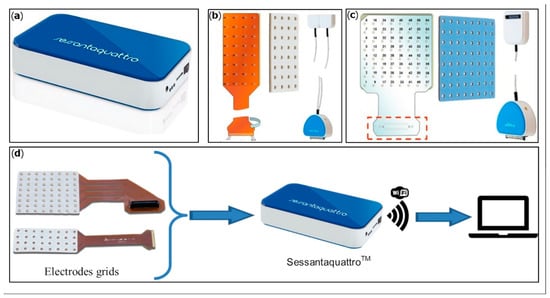 (a) Sessantaquattro main unit; (b) 32-electrode grid, corresponding biadhesive foam pad and adapter; (c) 64-electrode grid, corresponding biadhesive foam pad and adapter; (d) grids related to the Sessantaquattro main unit data acquired. The Sessantaquattro unit can transfer electromyographic signals wirelessly to an external laptop.