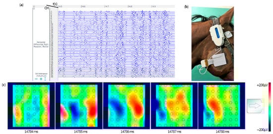 Extract of single differentials of the electromyographic signals in the right masseter muscle, instrumented with a 64-electrode grid, during mastication (Horse ID 5). Masseter activation was observed. Time flow expressed in seconds is indicated on the top (timeframe between 14.5 to 15 s). Each horizontal line represents the signal difference between two consecutive channels in the corresponding electrodes column (a). The position of the grid over the masseter muscle is shown (b). From left to right five consecutive color maps show muscular activation (c). The color scale on the right side is the color map calibration (±200 μV).