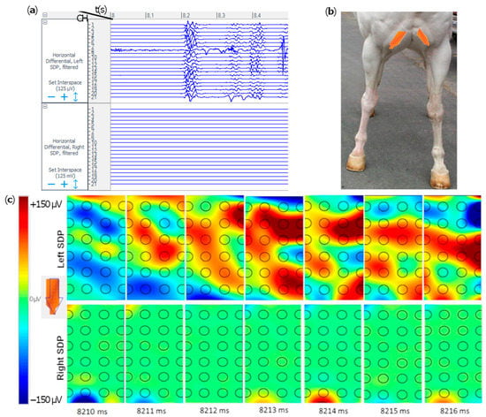 Extract of single differentials of the electromyographic signals in the superficial descending pectoral (SDP) muscles in a single horse. Some interference attributed by movement artifact are present in channel 8 (a). The position of the two electrode grids on the skin is shown in (b). Frame sequences (7 milliseconds) show the activation map of the SDP muscles during left forelimb forward stride. The time is reported below the frames sequence (from 8 to 8.5 s). Color maps shown are relative to the left and right SDP activity (c). The color scale on the left side is the color map calibration (−150 and +150 μV). The orientation grid with the arrow indicates the direction of the computed differential. In the left SPD, two positive depolarization waves (red waves) are clearly detectable, followed by a negative repolarization wave (in blue) traveling distally along the muscle. Conversely, the right SPD muscle shows no activation in the same epoch.