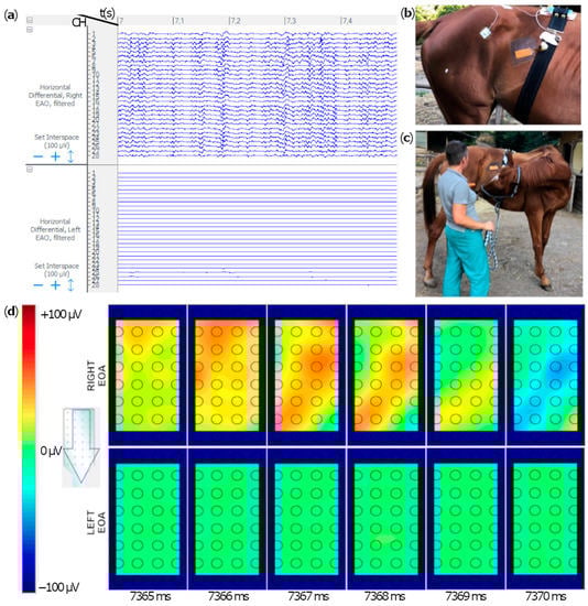 Extract of the single differentials electromyographic signals in the right and left EAO muscles, instrumented simultaneously with 32-electrode grids, for 10 s in a horse. Time flow expressed in seconds is indicated on the top (from 7 to 7.5 s). Each horizontal line represents the signal difference between two consecutive channels in the corresponding electrodes column (a). Electrode grids’ positions and orientations are shown in panels (b). Horse was given a carrot to obtain a sustained chin-to-lateral flexion (c). Activation maps of an instrumented portion of the right External Abdominal Oblique (EAO) muscles in six consecutive color maps, from left to right (d). Color scale of the image is set between −100 μV and + 100 μV. Maps in the upper line represent muscular activation of the right EAO, whereas maps in the lower line represent the left EAO activation. Two action potentials (red waves) are travelling peripherally. The red waves split indicates the innervation zone (IZ) in the muscle, followed by a repolarization wave (in blue), as shown in (d).