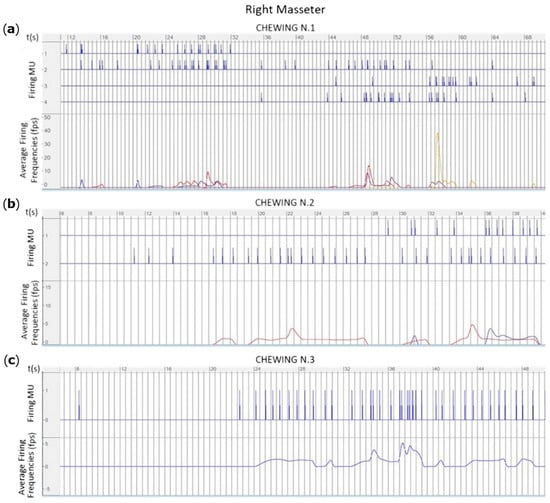 During repeated episode of mastication, masseter muscle had similar spectral features to those observed in the right EAO.