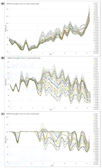 To analyse myoelectric manifestations of muscle fatigue and allow comparison between different variables, muscles and subjects, a fatigue plot was generated. Myoelectrical signs of fatigue are identified by an increase in RMS values within time and a decrease in MNF and MDF values. This fatigue indicators’ pattern is related to the reduction of muscle fiber conduction velocity, which decreases more or less rapidly depending on the level of contraction and causing a change in the power spectrum of the sEMG toward the lower frequencies, with a decrement of the mean and median spectral frequencies [2,25].