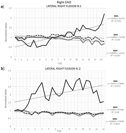 Normalized means of the root mean square (RMS, black continuous line), mean frequency (MNF, black dashed line) and median frequency (MDF, contoured black line) of the 32-electrode grid positioned on the external abdominal oblique muscle during two repetition of right chin-to-lateral flexions motor task. The graph (a) corresponds to the first repetition, while the graph (b) corresponds to the second repetition. The regression lines (dotted lines) enable to capture the trend of RMS, MNF and MDF during time and provide the R2 explanatory model power.