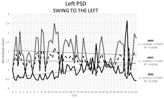 SDP muscle was considered only during the left swinging motor task, due to the short duration of the task and the loss of contact between the skin and the electrodes grid during the forward and backward strides. The RMS increased during the muscular activation of SDP muscle, while the MNF and MDF tended to decrease over time (Figure 8).