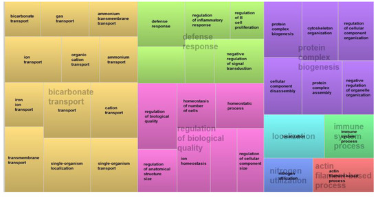 A total of 36 DE genes were shared by both tissues, and 91.6% of the common genes were upregulated in the FHS-affected group (Table 3). Some of those genes have already been highlighted in other studies [14,16,17]. However, when the common BPs were evaluated, most of them were related to ion transport, defense response and those related with tissue homeostasis (Figure 1).