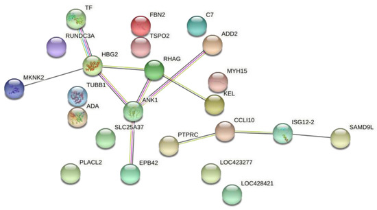A gene network was constructed based on the 36 common DE genes. From those, 23 were recognized by Stringdb tool, where it was possible to observe a main network of grouped genes related to ion transport and translation factors (Figure 2). The transferrin (TF) gene is involved in antimicrobial activity, while some genes such as Hemoglobin subunit gamma-2 (HBG2) and Rh-associated glycoprotein (RHAG) are involved in oxygen and ion transport. Another group connected the PTPRC, CCL10, ISG12-2 and SAMD9L genes that are most related to the immune response BP (Figure 2).
