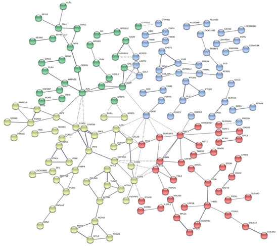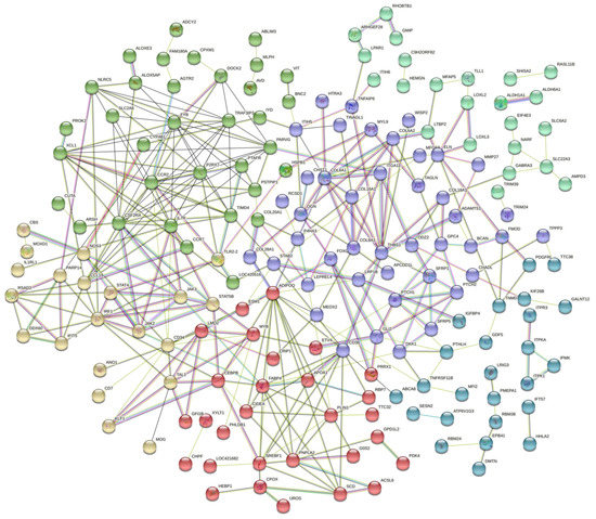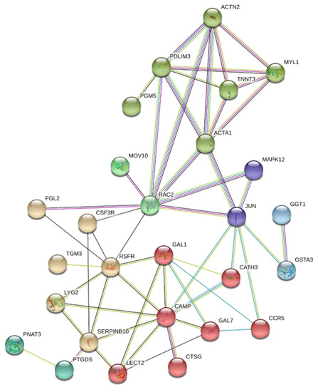 Gene network of unique DE genes in the articular cartilage from normal and FHS-affected broilers using STRING. Colored circles represent genes with similar functions or acting in similar pathways, and lines represent the predicted interactions between genes.