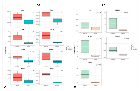 A relative quantification using qPCR was performed to confirm the expression profile of eight chosen DE genes in the GP using eight samples from the four normal and four from the FHS-affected group. The genes selected were solute carrier family 4 member 1 (SLC4A1), Rh- associated glycoprotein (RHAG), ankyrin 1 (ANK1), MAP kinase interacting serine/threonine kinase 2 (MKNK2), spectrin beta, erythrocytic (SPTB), adenosine deaminase (ADA), complement C7 (C7) and erythrocyte membrane protein band 4.2 (EPB42). Gene sequences were downloaded from Gallus gallus on Genebank (http://www.ncbi.nlm.nih.gov/gene/, accessed on 31 January 2022) and Ensembl (www.ensembl.org, accessed on 31 January 2022). Primers were designed in exon–exon junctions using the Primer-Blast online tool [26], and their quality was evaluated in the NetPrimer online software (http://www.premierbiosoft.com/netprimer/, accessed on 31 January 2022) (Table 1). For AC, the analysis was also performed in eight samples for five genes (SPTB, MKNK2, SLC4A1, C7 and EPB42), since the RHAG, ANK1 and ADA genes have already been confirmed in the analyzed population by Hul et al. [17]. Ribosomal protein 4 (RPL4) and Ribosomal protein 30 (RPL30) genes were used as reference for GP, and Ribosomal protein 5 (RPL5) and Ribosomal Protein Lateral Stalk Subunit P1 (RPLP1) for AC, as described by Peixoto et al. [15] and Hul et al. [17], respectively. The cDNA was synthetized using SuperScript III First-Strand Synthesis SuperMix (Invitrogen, Waltham (MA), USA), and qPCR reactions were carried out in QuantStudio 6 (Applied Biosystems, Waltham (MA), USA) equipment. The reactions had a final volume of 15 μL with 1×GoTaq qPCR Master Mix with BRYT Green (Promega, Madison (WI), USA), 0.13 µM of each primer and 2 μL of cDNA. Cycle threshold (Ct) mean for each replicate sample was obtained and normalized using the geometric mean of the reference genes, calculating 2−ΔCt [27]. Statistical analyses for group comparisons were performed using Mann–Whitney–Wilcoxon test in the R environment, considering DE as the genes with p ≤ 0.05.
