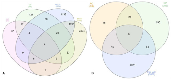 (A) Venn diagram constructed with DE genes from normal and femoral head necrosis and/or FHS-affected samples in four evaluated datasets. AC: chicken femoral articular cartilage; GP: chicken femoral growth plate; Hip_AC: human articular cartilage; Blood: human peripheral blood. (B) Venn diagram constructed with DE genes from normal and femoral head necrosis and/or FHS affected samples in three evaluated datasets. AC: chicken femoral articular cartilage; GP: femoral growth plate; Hip_AC: human articular cartilage.