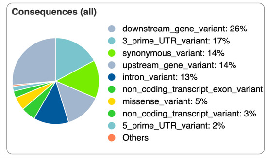 A total of 89,823 variants (SNPs and InDels) were found in the analyzed samples with the GATK tool. Out of those, 89 differed between the normal and FHS-affected groups (Supplementary File S1: Table S6). These 89 variants were processed in the VEP tool and approximately 3% from all of them (three) were first described in the current study, while 86 (~97%) have already been identified in chickens. One of the three novel SNPs was located in the 5′ UTR region of the NET1 (Neuroepithelial Cell Transforming 1) gene, another SNP overlapped the downstream region of two genes, CCM2 Scaffold Protein (CCM2) and NAC Alpha Domain Containing (NACAD, ENSGALG00000050931—predicted), and the other was a missense variant in the Staphylococcal Nuclease and Tudor Domain Containing 1 (SND1, ENSGALG00000054297—predicted). Variants were mainly classified as downstream gene variant, synonymous variant, upstream gene variant, intron variant, 3′ prime UTR variant and missense variants (Figure 7).