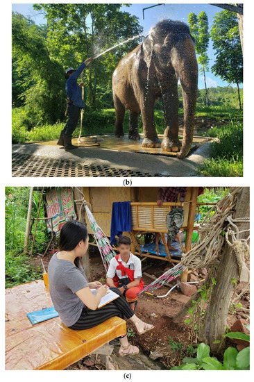 (a): A traditional annual ‘Shrine of Household God Worship’ ceremony. The elephants are offered sugarcane, banana, mango, and various types of food and worshiped by the local villagers. (b): Uncle ‘Ju’ (a senior mahout) is giving ‘Boon Nim’ a bath every morning after her breakfast. Boon-Nim is a retired geriatric elephant who has lost all her teeth. To prepare for her meal, Napier grass and sugarcane are ground up before mixing with feed pallets, tamarind paste, rock salt, and supplementals. (c): The interviewer was accepted at the workplace. A hut in the background is a house provided by the sanctuary.