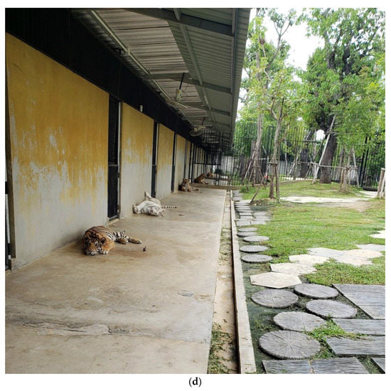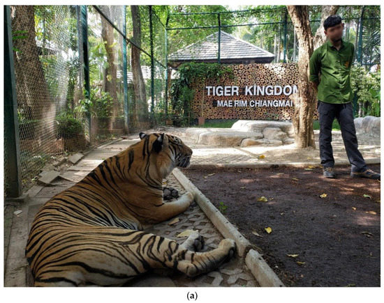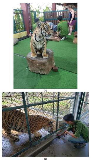 While young tigers are typical in tourism, some adult tigers continue to meet tourists, as shown in Figure 2a. Primarily tiger cubs are introduced to tourists, with close supervision from the tigers’ caregivers, as in Figure 2b. Older tigers that have retired from meeting tourists can be given environmental enrichment, shown in Figure 2c. While waiting for meeting with tourists, tigers may be on short chains, as in Figure 2d.