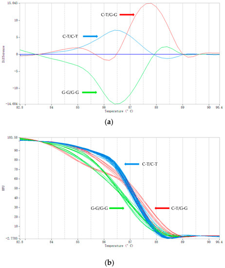 Using an HRM analysis kit (Tiangen, Beijing, China), the total reaction volume was 10 μL, including 5 μL of 2 × HRM Analysis PreMix (with EvaGreen) with 0.2 μL each of upstream and downstream primers, 10 μM of downstream primers, and 1 μM of upstream primers as well as 0.2 μL of an unlabeled probe (concentration 10 μM), 3.9 μL of ddH2O, and 0.5 μL of DNA amplification using PikoRealTM real-time fluorescence quantitative PCR equipment (Thermo Fisher Scientific, Waltham, MA, USA). The PCR reaction program included pre-denaturation at 95 °C for 2 min and 50 cycles at 95 °C for 10 s and 60 °C for 30 s. The subsequent melting curve analysis consisted of 2 steps: denaturation at 95 °C for 30 s and renaturation at 60 °C for 1 min followed by a continuous fluorescence reading mode from 60 to 95 °C with a ramp rate of 0.02 °C/s. To ensure reliable genotyping results, the reactions were performed in triplicate. PikoRealTM 2.2.250.602 software (Thermo Fisher Scientific, Waltham, MA, USA) was used to evaluate the melting curves, normalize the plots of fluorescence versus temperature, and conduct automated genotyping based on the analysis of the HRM characteristics.