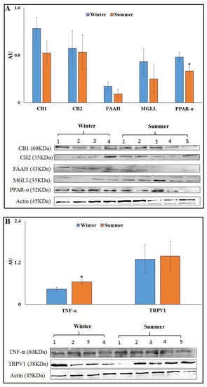 Protein abundance of endocannabinoid system (ECS) components in AT at 7 d PP from cows calving in winter (n = 9) or summer (n = 9). (A) Presented are the average abundances of CB1, CB2, FAAH, MGLL and PPAR-α, and representative immunoblots of 5 S and 4 W AT. (B) Presented are the average abundances of TNF-α and TRPV1, and representative immunoblots of 5 S and 4 W AT. * Significant with p ≤ 0.05.