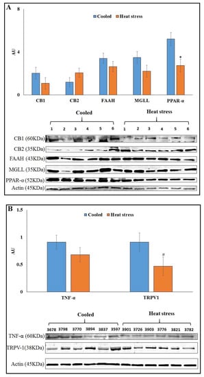 Protein abundance of ECS components in AT of late lactation cooled (n = 6) or heat-stressed cows (n = 6). (A) Presented are the average abundances of CB1, FAAH, MGLL and PPAR-α and immunoblots. (B) Protein abundance of TNF-α and TRPV1 in AT of late lactation cooled (n = 6) or heat-stressed cows (n = 6). * Significant with p ≤ 0.05. # Statistical tendency with p = 0.1.