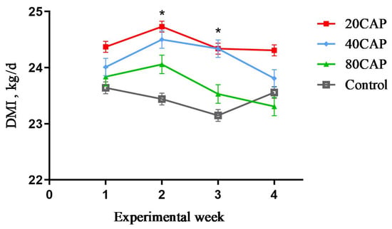 Change in average dry matter intake (DMI) throughout the study period in dairy cows that were fed a basal diet (control) or a basal diet supplemented with 20 (20CAP), 40 (40CAP), or 80 (80CAP) mg of CAP/kg of dry matter. Bars indicate the standard errors. Linear effect, p = 0.01; week effect, p < 0.01; week x treatment effect, p = 0.24. * indicates linear effect (p < 0.05).