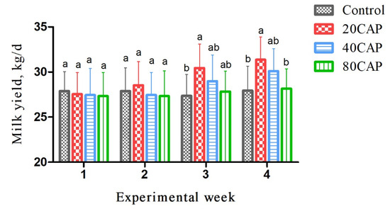 Change in milk yield throughout the study for cows fed a basal diet (control) or basal diet supplemented with 20 (20CAP), 40 (40CAP), or 80 (80CAP) mg of CAP/kg of dry matter. Bars indicate the standard error. Different letters (a, b) indicate the significant difference (p < 0.05).