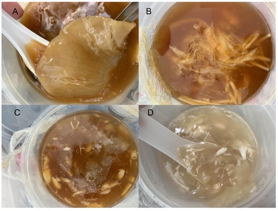 Examples of the products purchased in this work. (A) = soup 1, (B) = soup 2, (C) = soup 3 and (D) = soup 4. See Table 1 for the species identified in each.
