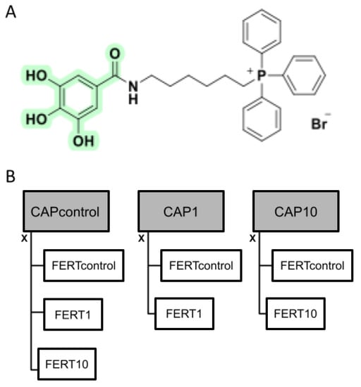 (A) Chemical structure of the hydroxybenzoic acid mitochondria-directed AntiOxBEN2 and (B) experimental design. To evaluate the effect of AntiOxBEN2 on bovine sperm capacitation and fertilization processes, this molecule was added to the capacitation (CAP) and/or to the fertilization (FERT) media, at the concentration of 0 (control), 1, and 10 µM, giving rise to seven groups. CAPcontrol: capacitation medium without supplementation; CAP1: capacitation medium supplemented with 1 μM of AntiOxBEN2; CAP10: capacitation medium supplemented with 10 μM of AntiOxBEN2; FERTcontrol: fertilization medium without supplementation; FERT1: fertilization medium supplemented with 1 μM of AntiOxBEN2; FERT10: fertilization medium supplemented with 10 μM of AntiOxBEN2.