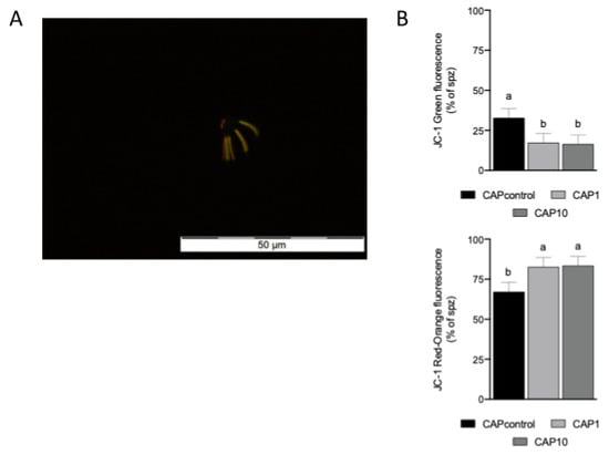 Effects of the mitochondria-targeted hydroxybenzoic acid derivative AntiOxBEN2 supplementation on mitochondrial membrane potential (MMP) of spermatozoa during the capacitation process. (A) Typical image of bovine spermatozoa stained with the florescent probe 5,5′,6,6′-tetrachloro-1,1′,3,3′-tetraethylbenzimidazolcarbocyanine iodide (JC-1, Invitrogen), as an indicator of mitochondrial activity. Labeled sperm showed a clear midpiece-only staining pattern; the midpiece was either homogeneously green (low DΨmit) or with speckles of yellow/orange/red (high DΨmit). (B) Percentage of spermatozoa emitting yellow/orange/red (high DΨmit) (down panel) and green (low DΨmit) (upper panel) fluorescence after capacitation in the presence or absence of AntiOxBEN2 (1 and 10 µM) supplementation. The data (mean ± SEM, 6 replicates) obtained with AntiOxBEN2 were compared to control using the mixed procedure/PDIFF of SAS. Significant differences between the indicated conditions are marked by different letters (a ≠ b, p < 0.05). CAPcontrol: capacitation medium without supplementation; CAP1: capacitation medium supplemented with 1 μM of AntiOxBEN2; CAP10: capacitation medium supplemented with 10 μM of AntiOxBEN2.