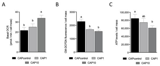 Mitochondrial oxygen consumption is a sensitive indicator of spermatozoa health since it is positively correlated with traditional measures of sperm function, including motility and viability []. Consequently, the impact of AntiOxBEN2 on mitochondrial oxygen consumption of spermatozoa during capacitation was measured through variations on cellular oxygen consumption rate (OCR) using the Seahorse XF-96 Extracellular Flux Analyzer. Interestingly, AntiOxBEN2 dose-dependently increased spermatozoa basal OCR (control = 21.7 ± 2.88 pmol/min; CAP1 = 25.1 ± 3.05 pmol/min; and CAP10 = 33.9 ± 2.88 pmol/min, p = 0.004 and p = 0.04, respectively) (Figure 3A). Similar to MMP measurements, a bull effect was not observed for cellular OCR measurements (p > 0.05).