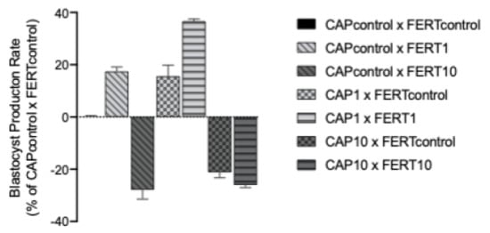 Embryo production data were analyzed with the procedure GLIMMIX using the binary distribution and the logit as the link function. The generalized linear mixed model included treatment (CAPxFERT) and session as the fixed and random effects, respectively. Furthermore, comparisons between groups were performed using the PDIFF test. Data were analyzed in GraphPad Prism 8.0.2 software (GraphPad Software, Inc., San Diego, CA, USA), with all results being expressed as means ± standard error of the mean (SEM) for the number of experiments indicated. Values were considered statistically different when p ≤ 0.05.