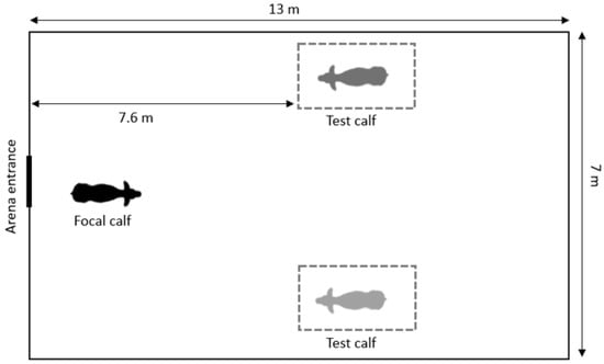 Directly following the habituation period, the social preference test was performed. Calves for the social preference test were selected based on their location relative to the focal calf in the main barn. Each calf was presented with a calf they were most familiar with (‘more familiar’ stimulus calf) and a calf that was a degree less familiar (‘less familiar’ stimulus calf), to explore the relative importance of physical contact vs. visual contact in the establishment of social bonds. For pair-housed calves, the non-focal pair calf was used as the ‘more familiar’ stimulus calf and the adjacent individually housed calf was used as the ‘less familiar’ stimulus calf. For individually housed calves, a calf from the adjacent pen was used as the ‘more familiar’ stimulus calf (either the neighboring non-focal pair calf or an adjacent individual calf) and a calf from elsewhere in the barn was used as the ‘less familiar’ stimulus calf. Calves used as stimuli in the social preference test remained in the individual wire mesh pens (0.9 by 1.8 m), which were placed on opposite sides of the arena, 7.6 m from the entrance (Figure 1). We randomized the placement of each of the stimulus calves to account for the effects of side bias and laterality effects, which are seen in mature cattle when contacting novel objects [], and in other species regarding direction and handedness (dogs: []; cats: []). Following movement to their position within the arena, stimulus calves were allowed approximately 5 min to habituate to their surroundings. Study personnel observed the behavior of stimulus calves to ensure they were not unusually reactive (e.g., vocalizations, locomotor play) prior to commencing the test. Once the stimulus calves were placed on their respective sides, the focal calf was brought back to the arena. On the walk back to the arena entrance, the focal calf was turned twice 360 degrees to reduce the possibility of the calf going immediately to a known area in the arena. The gates of the arena were positioned to align with the center of the arena to avoid directing the calf toward either side. The individual pen used to move the calf was lifted to allow the calf to enter the arena. The calf remained in the arena for 5 min for the preference test.