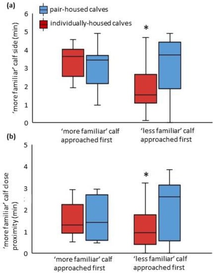 Effects of housing treatment and identity of first approached calf on duration of time spent on the side (a) or in close proximity (b) of the ‘more familiar’ calf, during a social preference test conducted at 4 weeks of age (at 29.3 ± 1.9 d of age). * Denotes significant pairwise difference between all other values (p < 0.05).