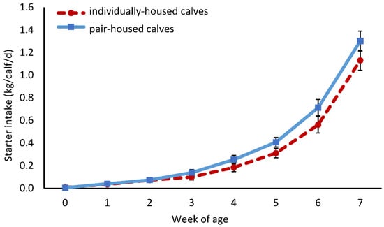 Starter intake (fresh weight) of calves housed individually (IH; n = 20) or in pairs (PH; n = 20 pairs) from birth to week 7 of age. Data were measured at the pen level and summarized by week. Error bars represent SE.