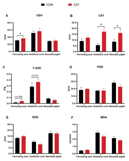 3.2. Antioxidant Enzyme Activities in Serum of Farrowing Sows, Umbilical Cords, and Neonatal Piglets