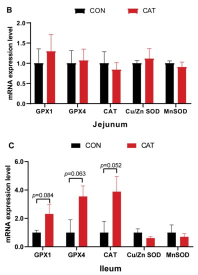 3.5. mRNA Expression of Genes Related to Antioxidant Function in the Placenta, Jejunum, and Ileum